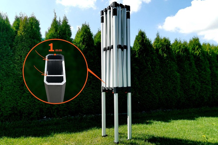 Unustage haprad terastorud. Meie telgi süda on kuusnurksed (heksagonaalsed) alumiiniumjalad, mis pakuvad oluliselt suuremat väändejäikust kui tavalised nelikantprofiilid. Anodeeritud alumiinium on loomupäraselt korrosioonikindel, mis tähendab, et teie telk näeb välja nagu uus ka pärast aastatepikkust välitingimustes kasutamist. Tänu alumiiniumi kergele kaalule on see mudel ideaalne kaaslane müügiesindajatele, spordimeeskondadele ja eksponentidele, kes hindavad lihtsat käsitsemist ja transporti tavalise auto pakiruumis.