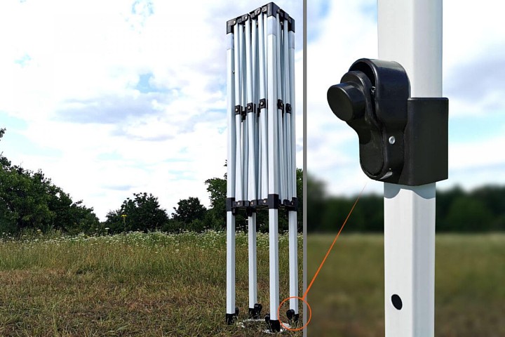 Kohustuslik on kiire kokkupanek ja aja säästmine. Tänu automaatse süsteemile ei pea enam tööriistu kasutama. Mõne sammuga on telk valmis toote müügiks. Iga osa on vahetatav kruvikinnitusmehhanismide abil. Hindame seda, kui konstruktsioon saab kahjustada, pole vaja uut osta, piisab kahjustatud osa vahetamisest. Esimesel aastal pakume tasuta varuosi.