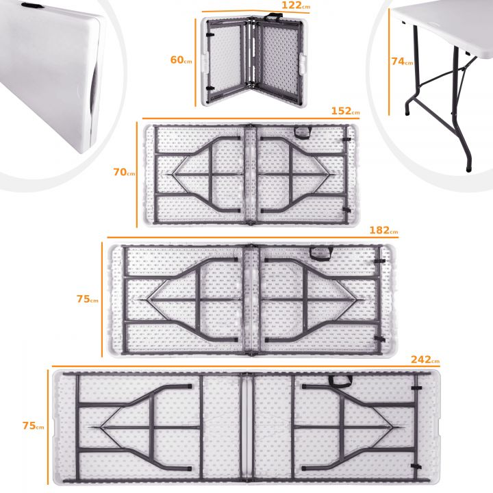 Parimad omadused hõlmavad kerget, pulbervärvitud jalgade konstruktsiooni ja patenteeritud lukustusmehhanismi, mis hoiab kokkupandud jalad tasaselt, kui neid ei kasutata. Lauaplaat on valmistatud HDPE laminaadist, mis on kriimustuskindel ja plekikindel. Kokkupandavad lauad on mitmekülgselt kasutatavad. Enamasti kohtame neid pidustustel ja vastuvõttudel, mida korraldavad catering-ettevõtted, kuid need on laialdaselt kasutatavad ka kodudes ja aedades.