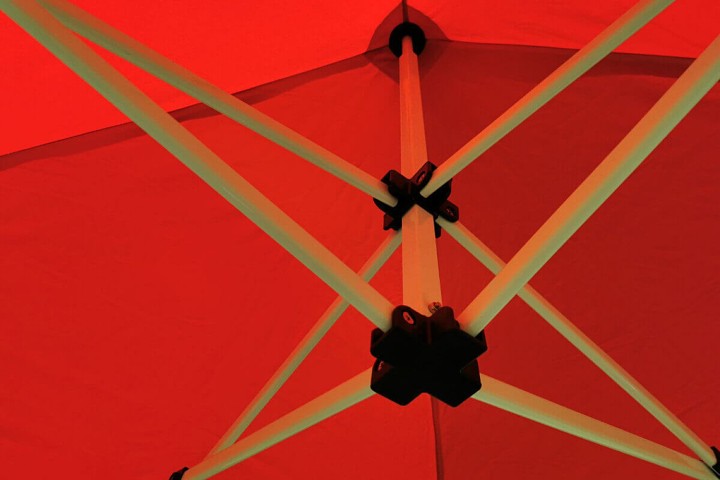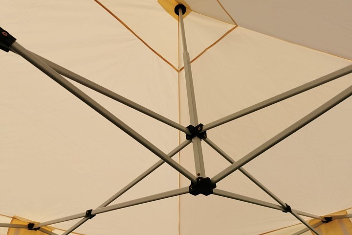 Tihe polüestrikangast on katusekate südames. Katuse sisemine PVC-kiht loob ideaalse varju. Iga ühendus on täiendavalt tugevdatud, telk on 100% veekindel. Kokkupandavad telk on ideaalne ka toodete hoiustamiseks laatadel, kui kõik teie tooted ei mahu esitluskohtadesse, saate need turvaliselt hoida naaber-telgis.