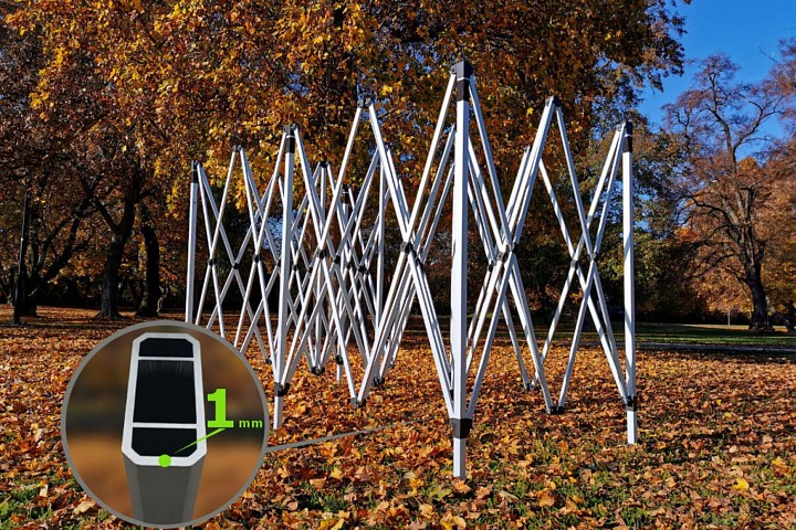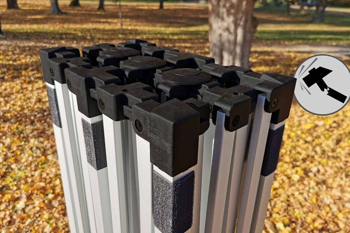 Kaasaegne disain rahuldab teid. Alumiiniumkonstruktsioon on ülikerge, telk on lihtne liigutada. Automaatse kokkupaneku süsteemi abil saab 3x6m telgi kergesti kokku panna ja lahti võtta igas kohas. Täiendavaid tööriistu pole vaja. Osasid saab lihtsalt vahetada tänu keeratavatele ühendustele.